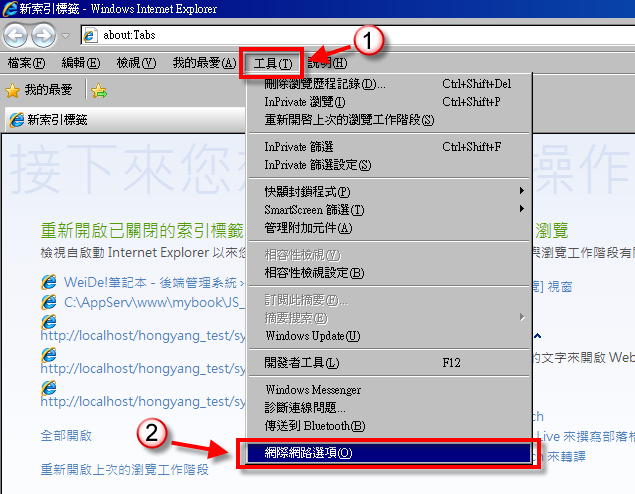 打開IE選 「工具」 → 「網際網路選項」。