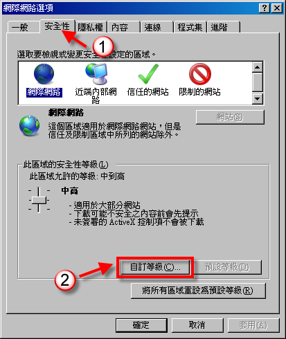 進入網際網路選項後選 「安全性」 → 「自訂等級」。