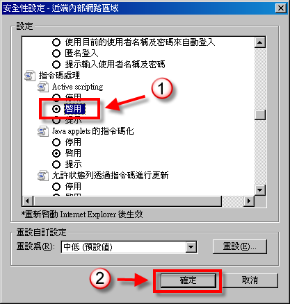 將「Active Scripting」選擇「啟用」後,按下「確定」,並把所有的 IE 視窗關閉後,再重新開啟 IE 即可。