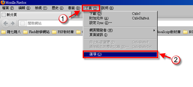 打開 Firefox 選 「工具」 → 「選項」。