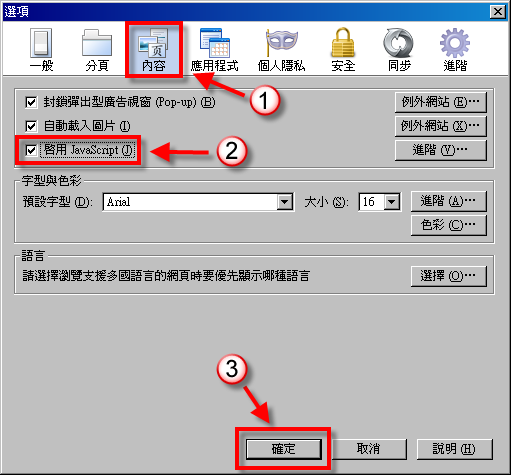 進入選項後選 「內容」,將「啟用Java Script(J)」打勾後,按下「確定」,並把所有的 Firefox 視窗關閉後,再重新開啟 Firefox 即可。