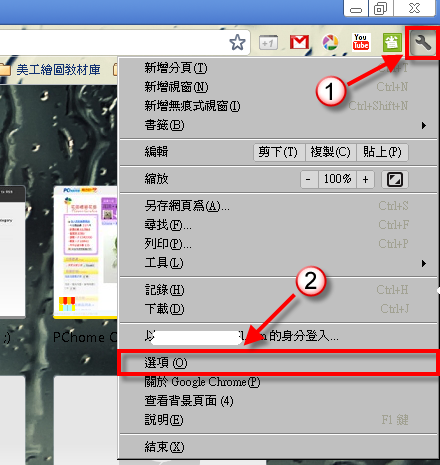 打開 Chrome 選右上角一個 "板手" 圖示 → 「選項」。