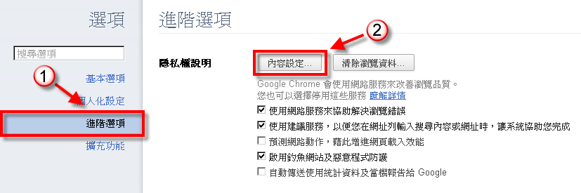 進入選項後選 「進階選項」 → 「內容設定」。