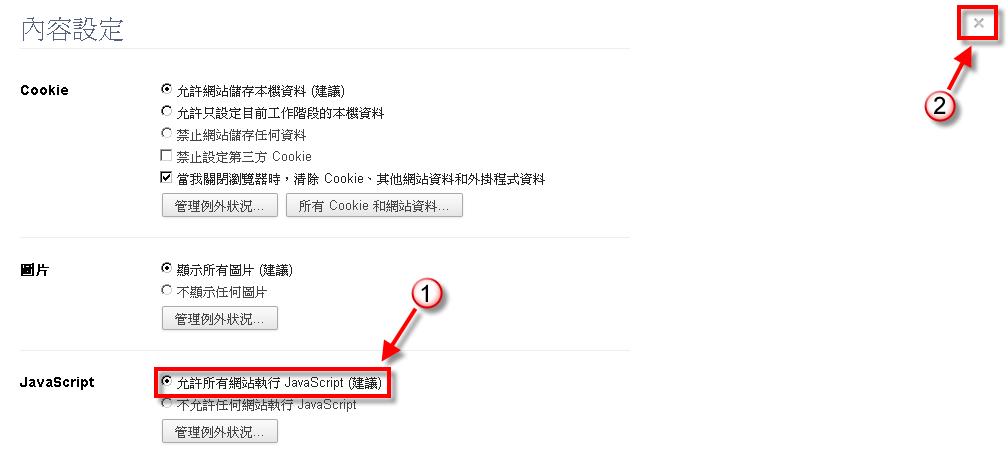 進入內容設定後,將「允許所有網站執行Java Script(建議)」打勾後,按下右上角的 "X"後,把所有的 Chrome 視窗關閉後,再重新開啟 Chrome 即可。